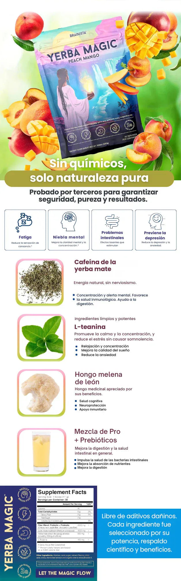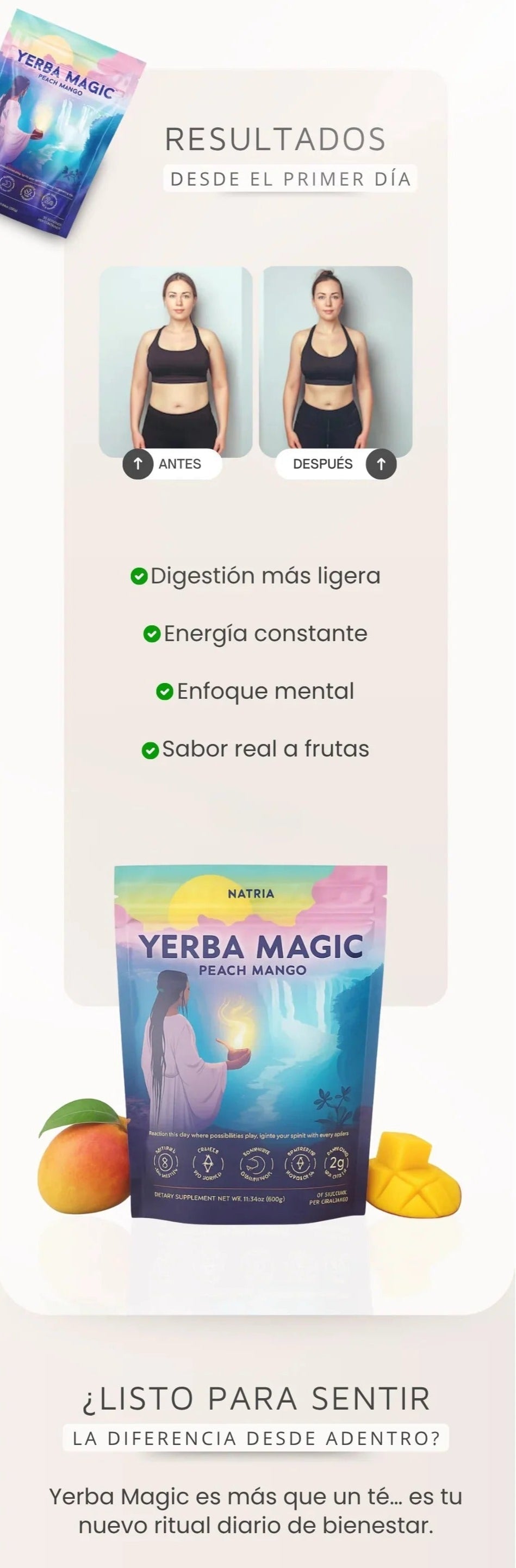 Yerba Magic Detox+ es una infusión natural que combina yerba mate, hongo melena de león, L-teanina y probióticos. Está diseñada para ayudarte a reducir medidas, mejorar la digestión y aumentar tu energía y enfoque mental de forma natural.